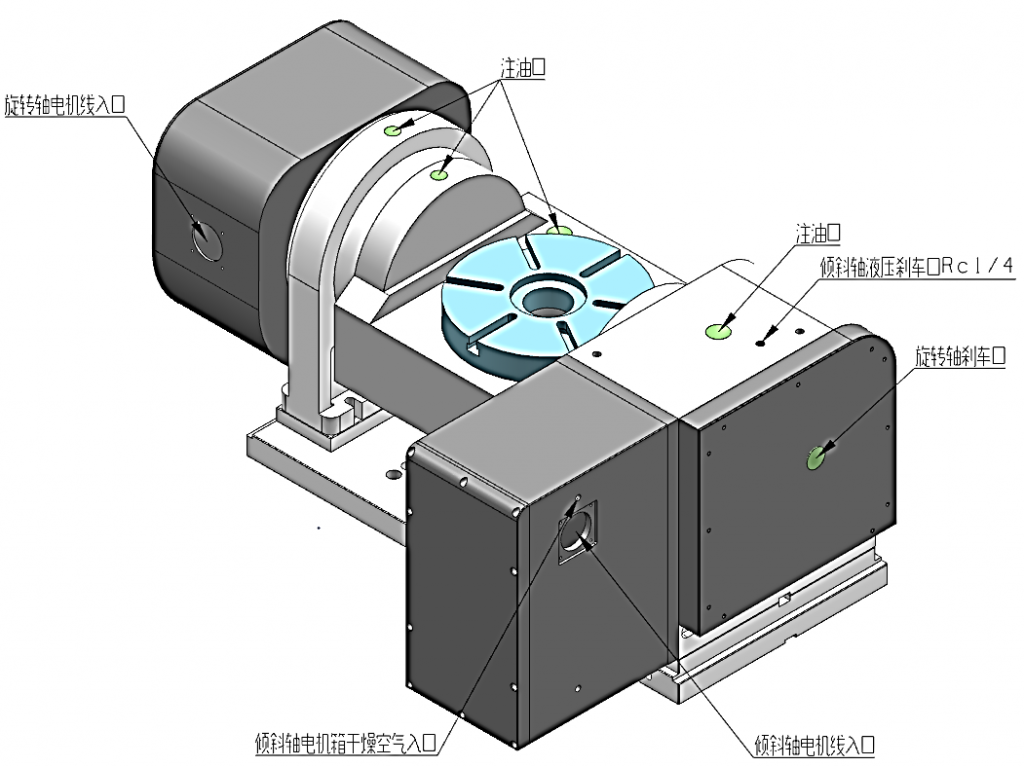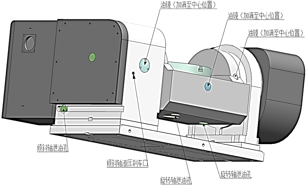 打開(kāi)轉(zhuǎn)臺(tái)附帶的說(shuō)明書(shū)在目錄中找到【潤(rùn)滑】一項(xiàng),按照其中注明的放油口和進(jìn)油口操作,轉(zhuǎn)臺(tái)上也有相應(yīng)的標(biāo)識(shí),以下是說(shuō)明書(shū)中標(biāo)識(shí)的范例: