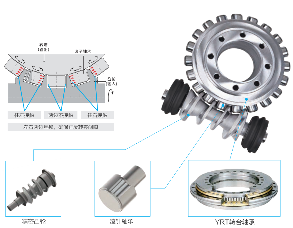 滾子與凸輪接觸面大 → 剛性比蝸輪蝸桿結(jié)構(gòu)轉(zhuǎn)臺(tái)更高